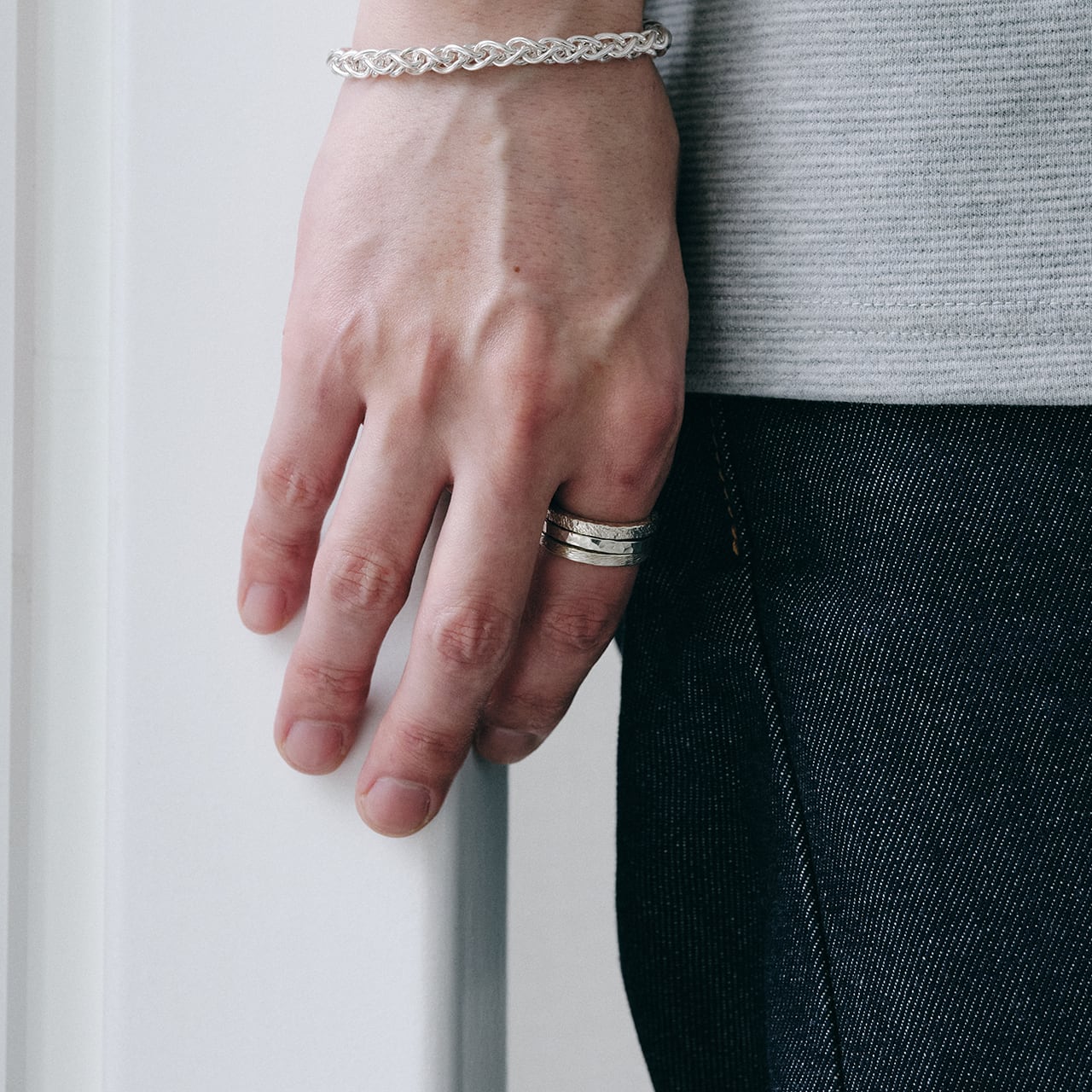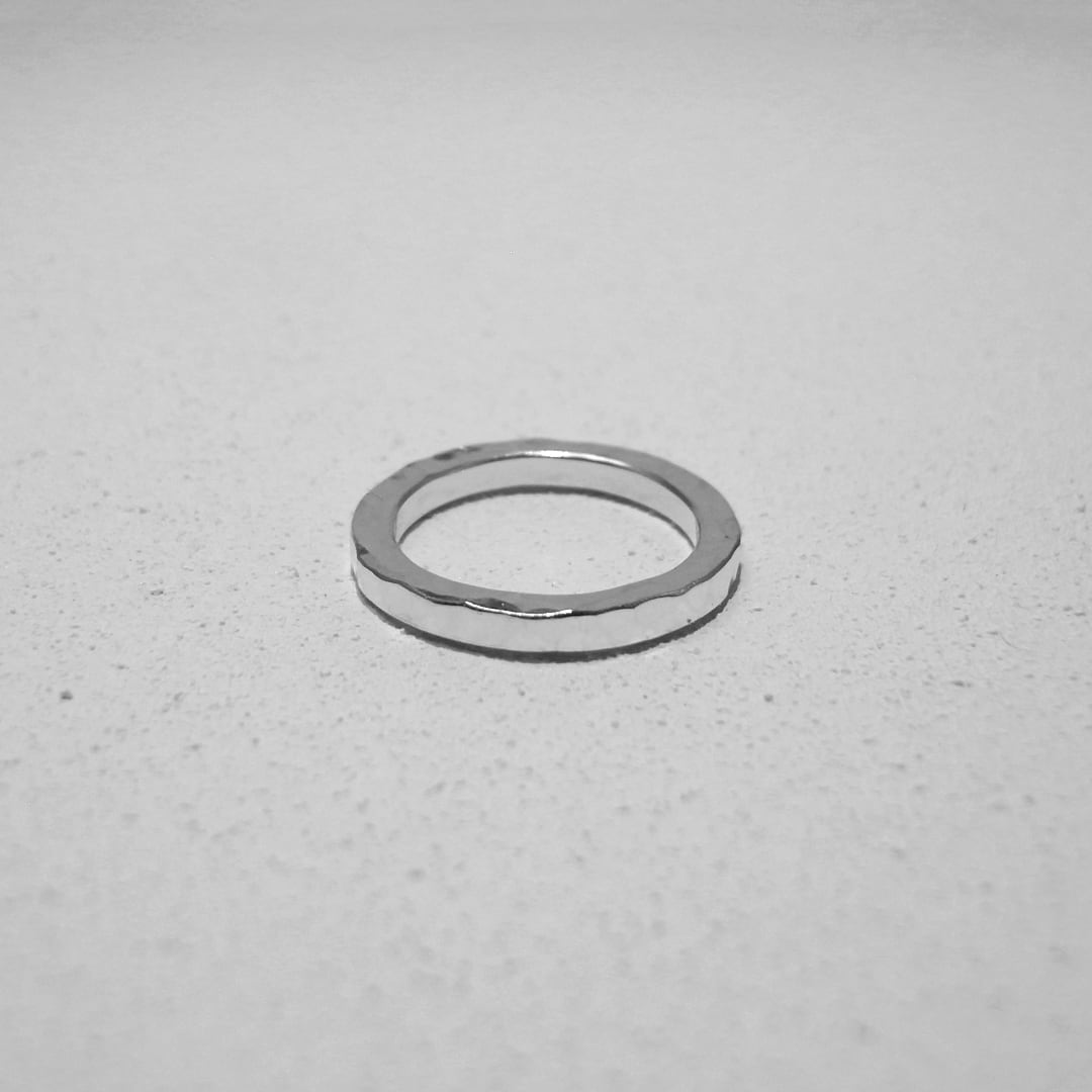 2.5mm×2.5mmの角線にハンマリングによるテクスチャーを施した細身のリング。